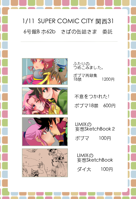 1/11のスパコミ関西「さばの缶詰」さまのサークルにて委託&売り子で参加いたします。インテは久しぶりですね。関西近郊のみなさま、よろしくお願いします!